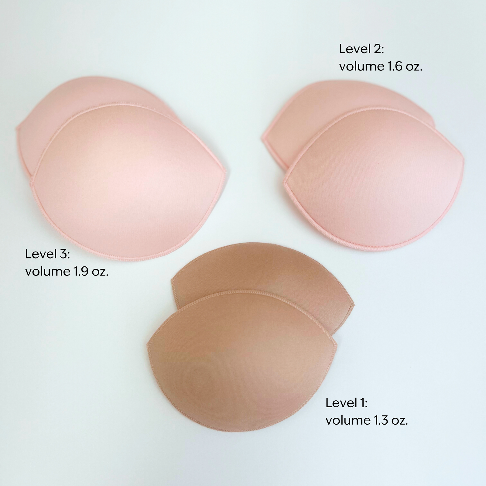 Three different sizes means you choose how much volume you want to add to your cup. For a smooth and flattering silhouette, make sure there is enough space in the cup for both your breast tissue and the inserts. (Level 1 fits best in sizes 32B and 32C.) Level 1 – 1.3 oz. Level 2 – 1.6 oz. Level 3 – 1.9 oz. TIP: Based on feedback, our cups are running a tad on the smaller side so size up if you are deciding between two sizes. If you have sizing questions, please reach out! We are happy to help you find the best fit. Email us at hello@livilulane.com.